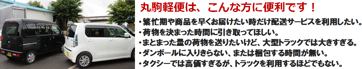 緊急を要するお荷物や日時指定のお荷物は、丸駒軽便が完全対応します。積み合わせなしで荷主様から配達先へ安心確実にお届けできるチャーター便をご利用下さい。
